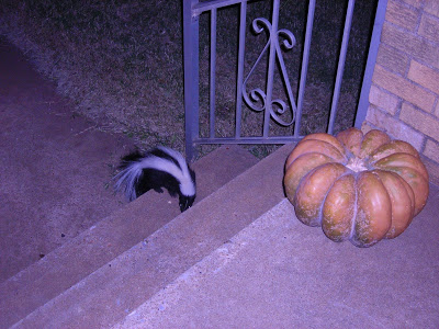 Meta Cranky will never be as talented, compost-wise, as Our Al, whose child has happily moved on to middle school. So Cranky Elementary is leaving Dead Pumpkin 2010 to the professionals. No, seriously. The professional compost company that services Cranky Elementary’s lunches will send a special truck for its post- Halloween offerings. This landfill diversion is all as it should be, and Meta Cranky can’t believe that any thinking person would let a pumpkin get oozy and smelly in his/her garbage can. Please. But she understands the folks in Cranky Home Town might be scratching their heads over Dead Pumpkin 2010 as part of somebody’s business plan. That’s because it’s much simpler in Cranky Hometown. You start with a pumpkin, like the one pictured above. From Cranky Girls’ Farm, 2008 vintage. Thanks for asking. Then you add a varmint. Raccoon. Possum. Skunk? Ok, that’ll work.